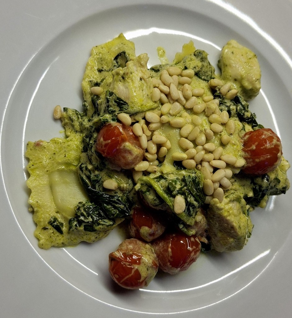 Ik heb namelijk de ravioli en de pesto gewoon kant-en-klaar gekocht. En weet je? Dat mag ook. Soms wil je gewoon snel iets lekkers op tafel zetten zonder lang in de keuken te staan.